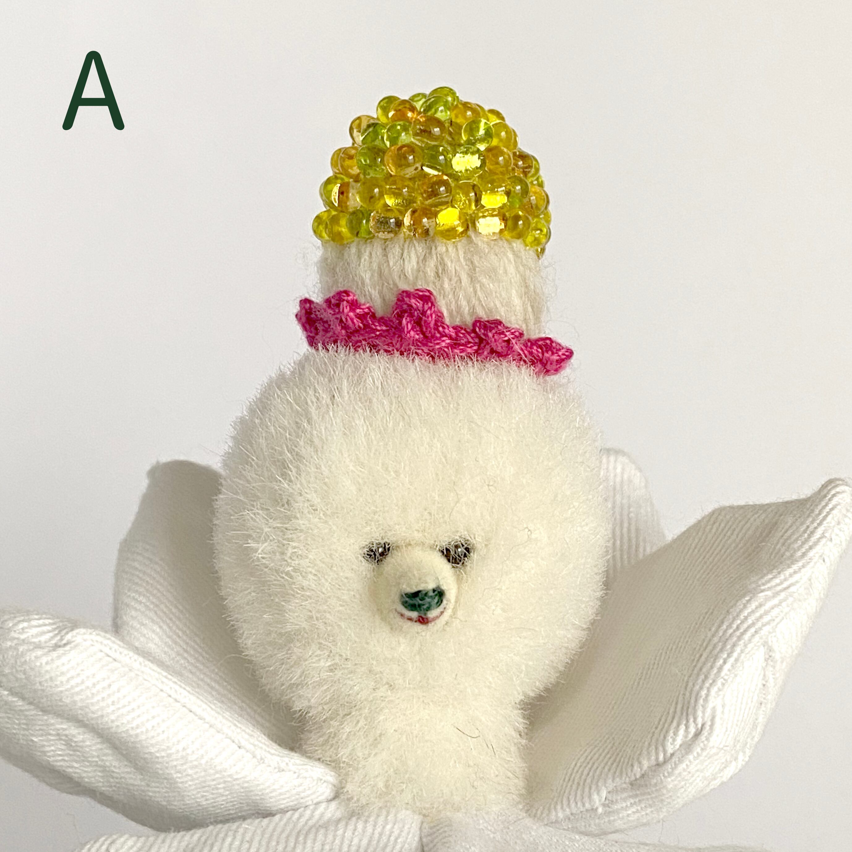 チェコビーズと手編みのレースで頭飾りのように表現しました。
